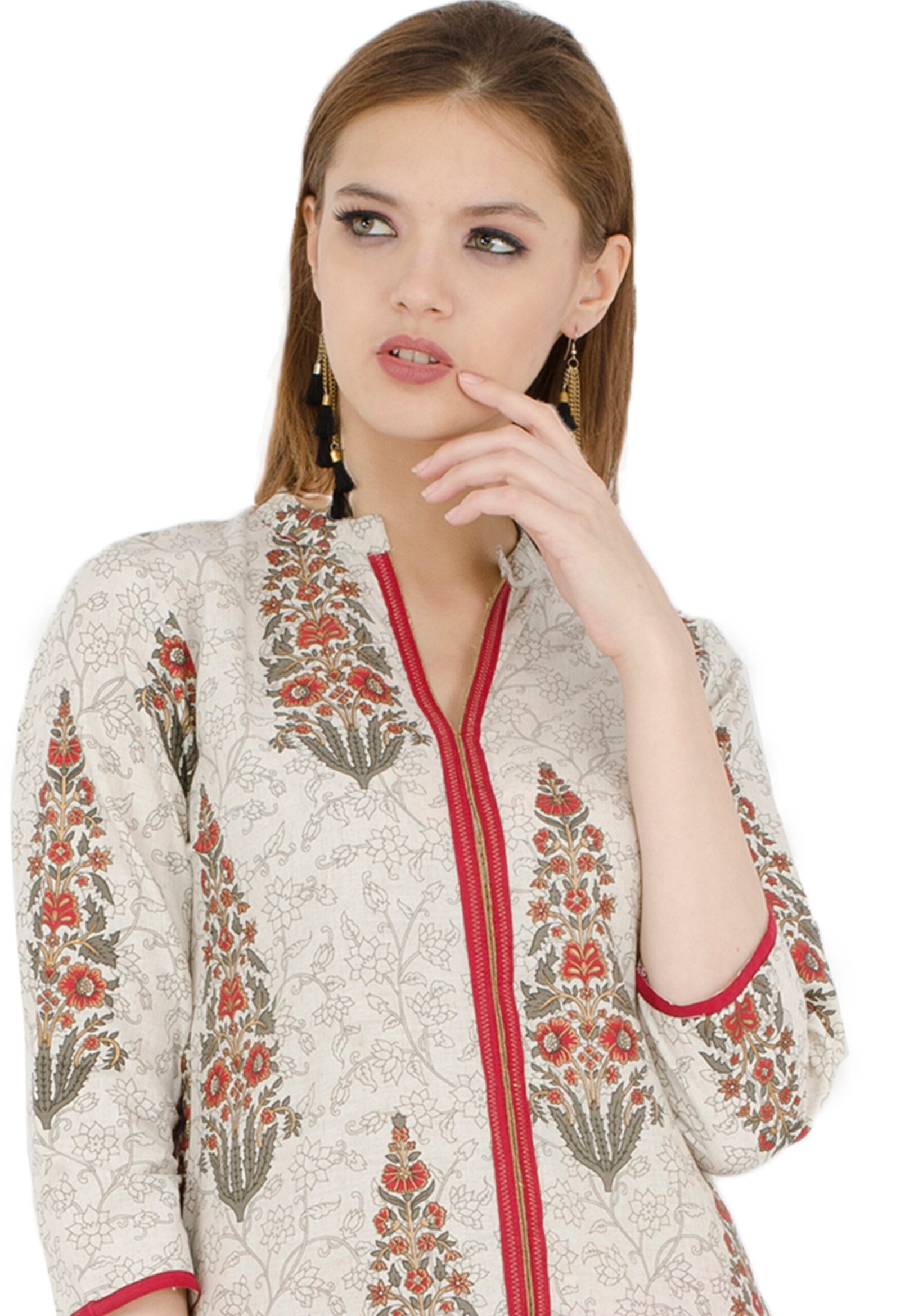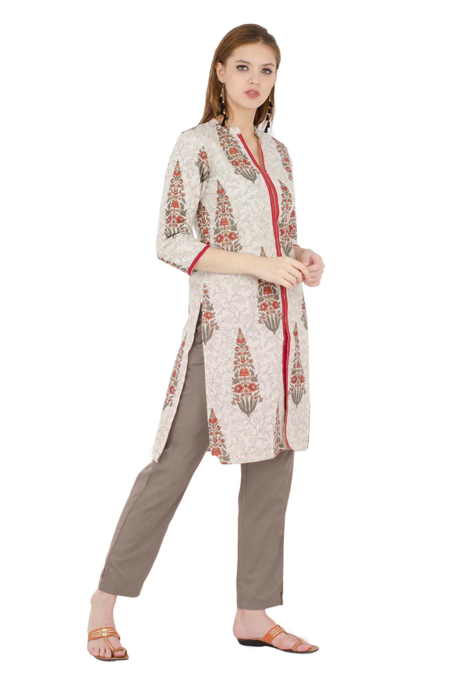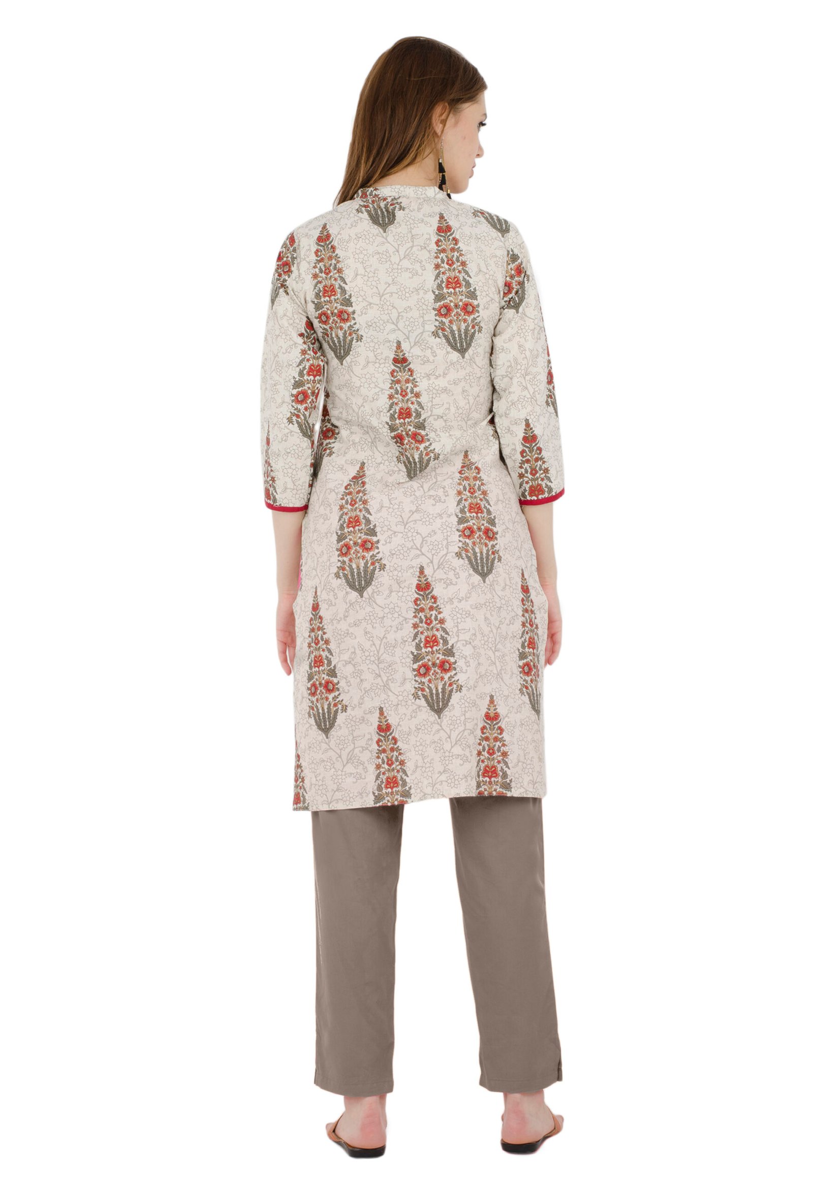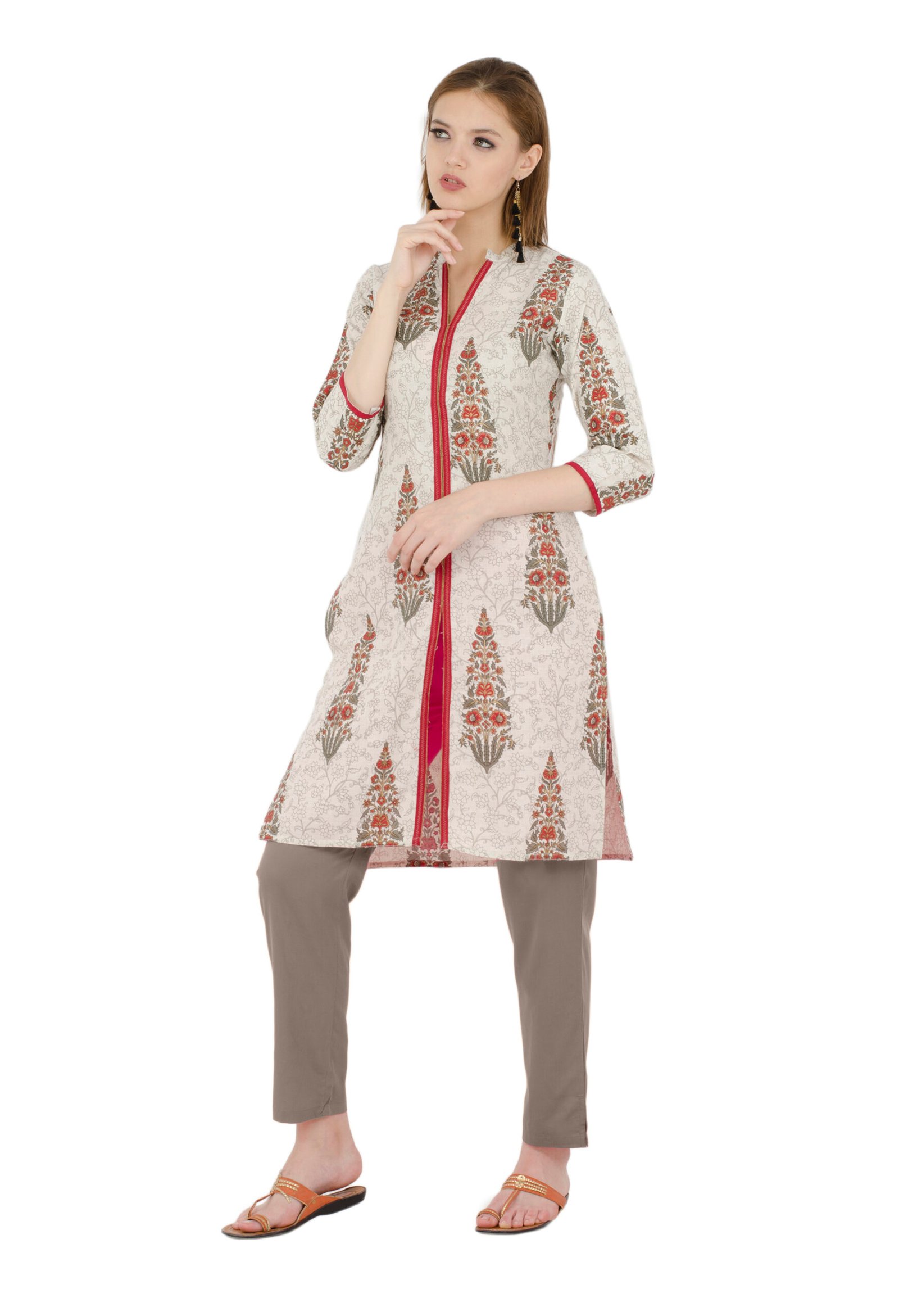 Cream Flax Printed Front Open Straight Ladies Kurta, Kurti