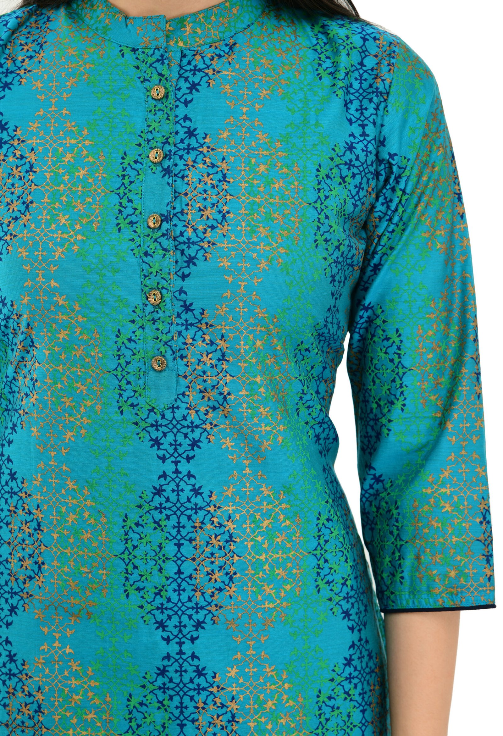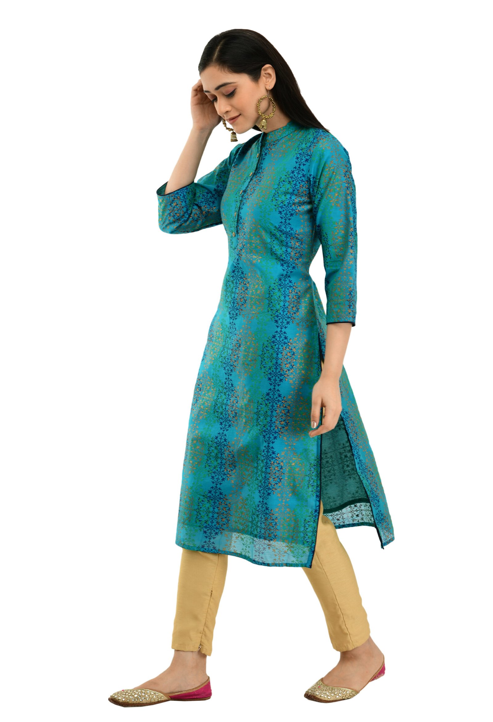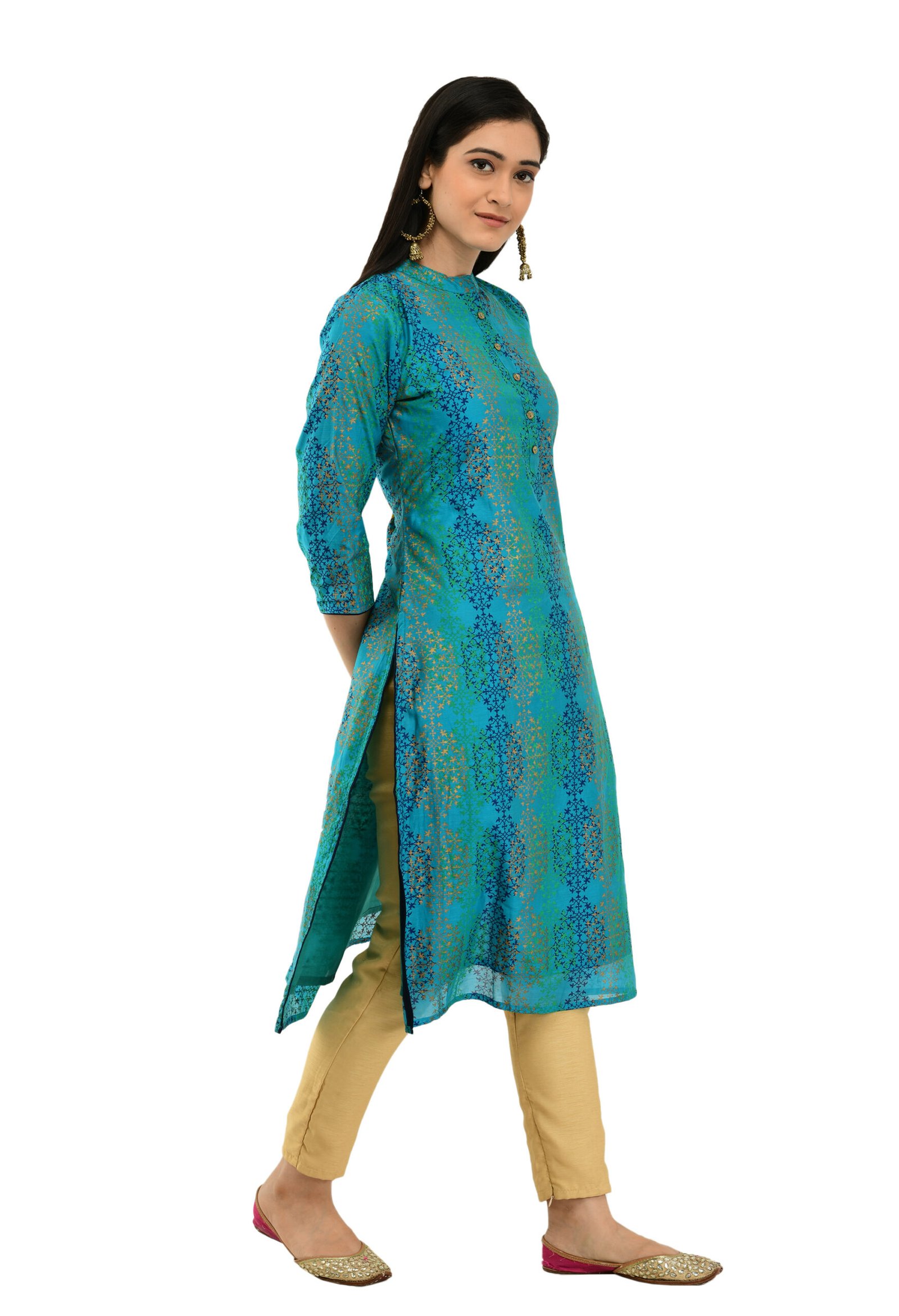 Elevate your style with this Teal Green Chanderi Printed Stylish A-Line Kurta for women. Made from rich Chanderi fabric, it features elegant prints and a flattering A-line silhouette. Perfect for festive occasions or special events, this kurta blends traditional charm with modern appeal for a graceful ethnic look.