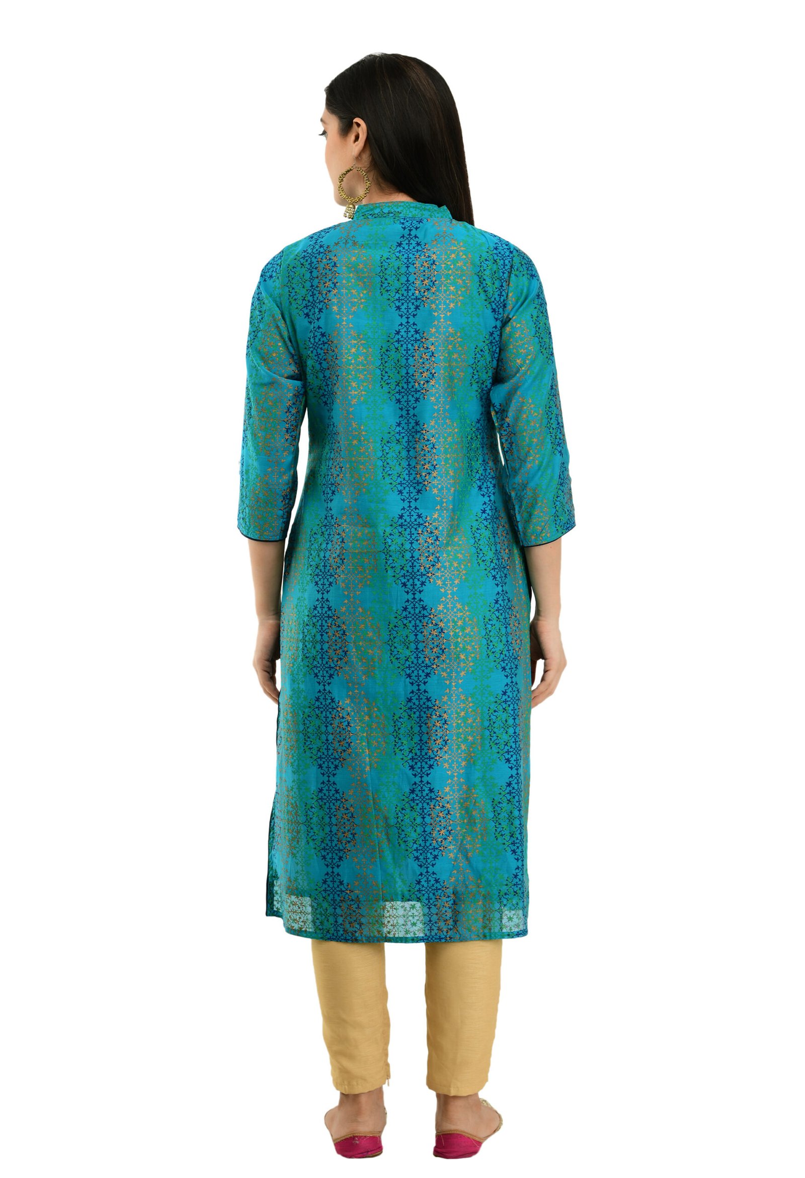 Teal Green Chanderi Printed Stylish A-Line Ladies Kurta, Kurti